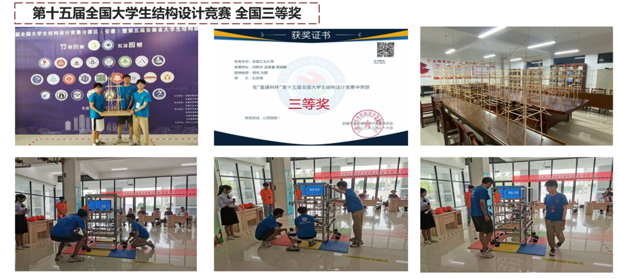 他积极参加学科竞赛,本科期间获得了“中国国际大学生创新大赛”全国金奖(创造我校建校以来在该赛事的最好成绩)、“第十五届全国大学生结构设计竞赛”全国三等奖、 “第十届全国大学生制药工程设计竞赛”全国三等奖、“第五届全国机器人专利创新创业大赛”全国三等奖、“第九届安徽省互联网+大赛”安徽省金奖”、“第五届安徽省结构设计竞赛”安徽省一等奖、“第六届安徽省大学生先进成图技术与产品信息建模创新大赛”安徽省三等奖、“第七届安徽省大学生先进成图技术与产品信息建模创新大赛”安徽省三等奖、第十一届华东区大学生CAD应用技能竞赛 华东区三等奖的优异成绩。
