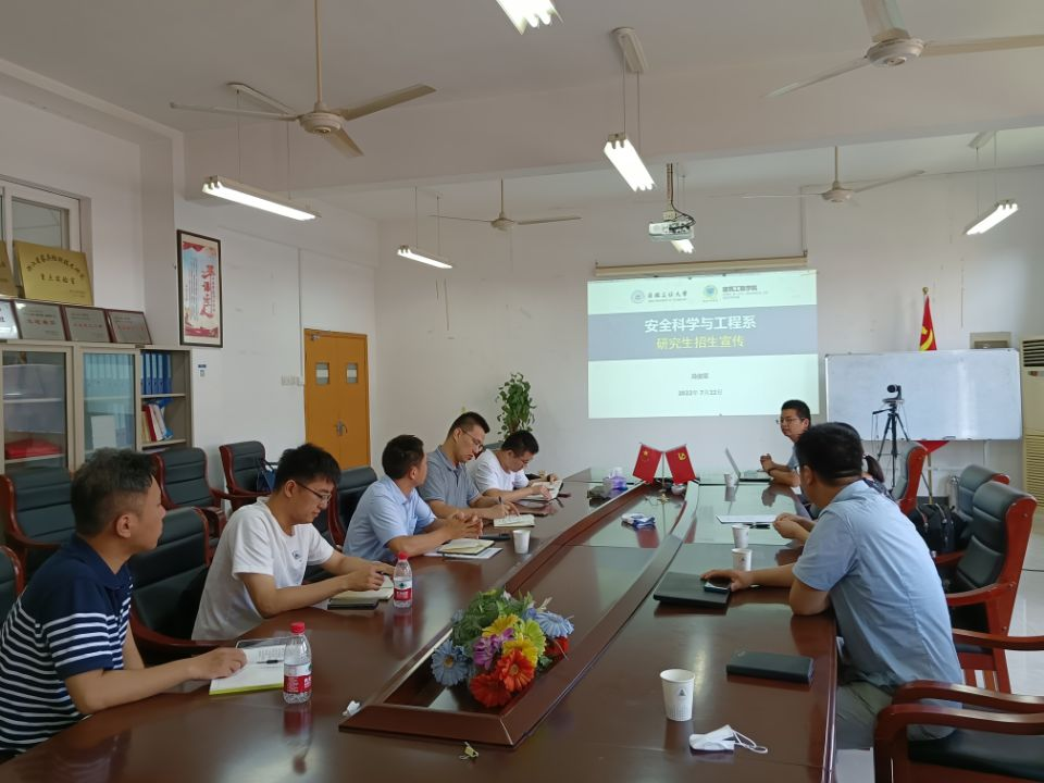 安全工程专业的办学历史、师资队伍、招生与就业、专业特色和科研等情况。双方重点围绕一流学科建设、专业认证的相关问题进行了深入交流,特别学科建设、实习实训、师资培养、招生就业等方面进行了详细的了解和探讨。此外,冯俊军还进行了冶金环境安全专业研究生招生宣讲。