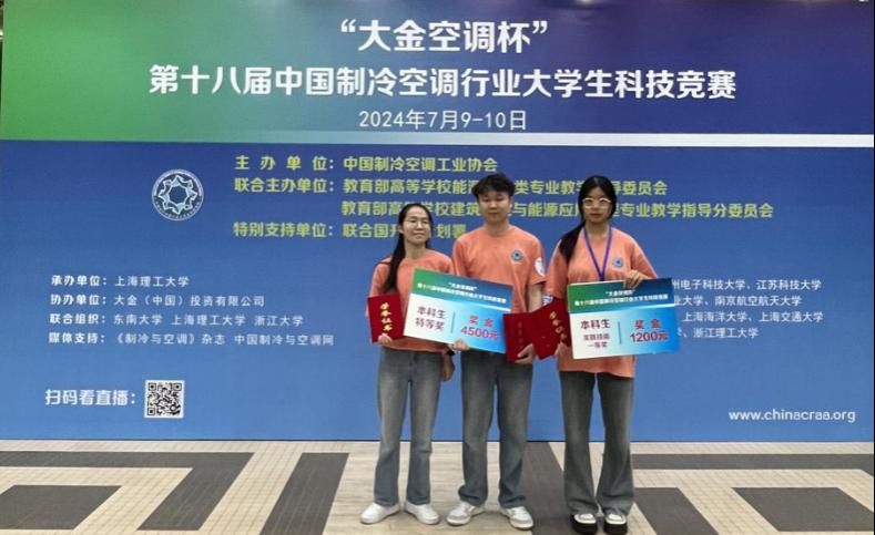 建筑环境与能源工程系夏曾嘉、余佳航、何珊等3名同学在程波、张样老师的带领下,参加了在上海理工大学举办的“大金杯”第十八届中国制冷空调行业大学生科技竞赛(华东决赛),荣获本科生组特等奖和本科生组实践技能一等奖,取得了历史性突破。